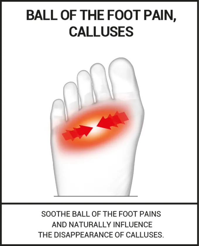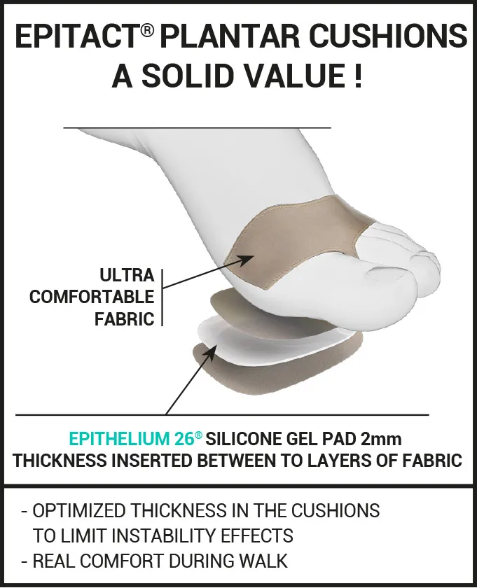 Do you have pain on the bottom of your forefoot? Hot, burning sensations? Feel like you’re walking on nails? Do you have corns or calluses? Whatever is affecting your feet, it often means intense pain that can make walking difficult. This pain is generally caused by wear to the fat head beneath your foot, which serves to spread out pressure. To overcome this, these foot cushions contain EPITHELIUM 26® (a genuine substitute for the foot’s fat pads), to make walking enjoyable again.